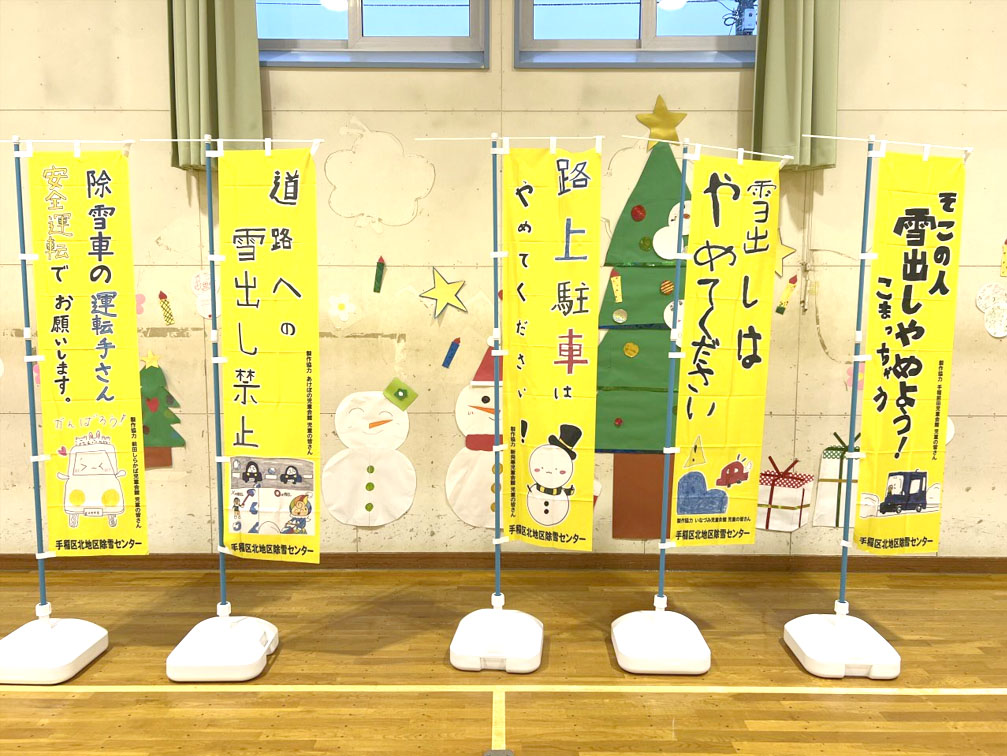 当マルチ所管する5ヵ所の児童会館に除雪作業の安全管理や迷惑行為など(雪出しや路上駐車、安全運転)を考え、のぼり旗にレイアウトを作成してもらい、出来上がったものは記念に各児童会館へ寄贈し、お礼の記念品を贈った。