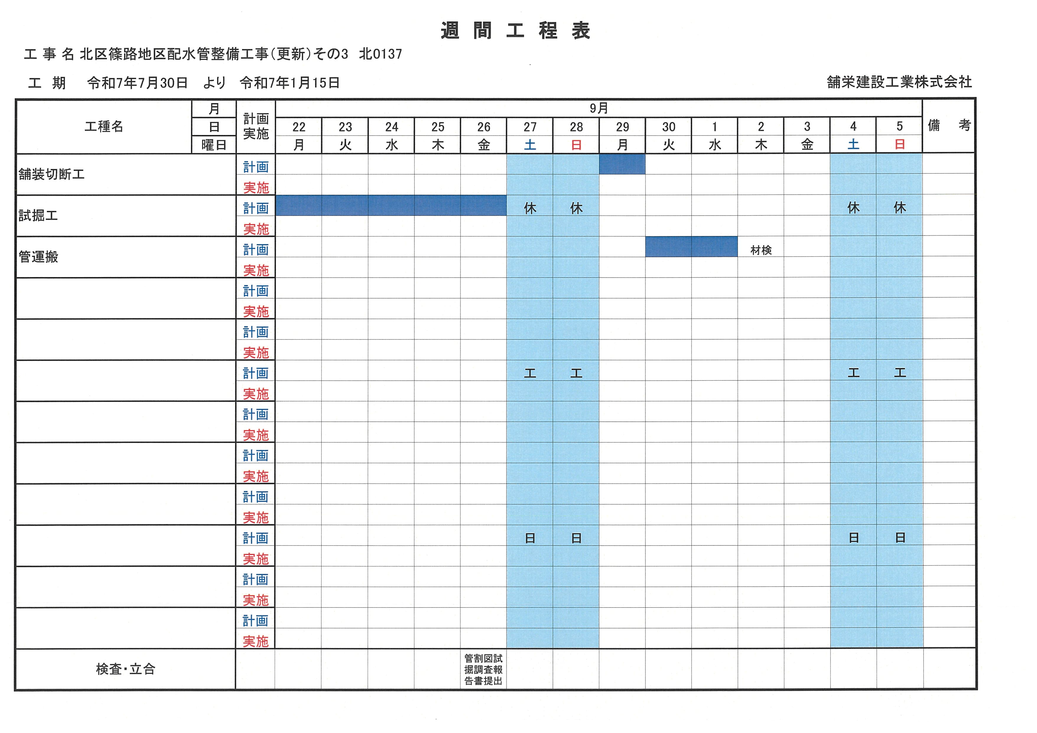 9月22日からの週間工程表になります
