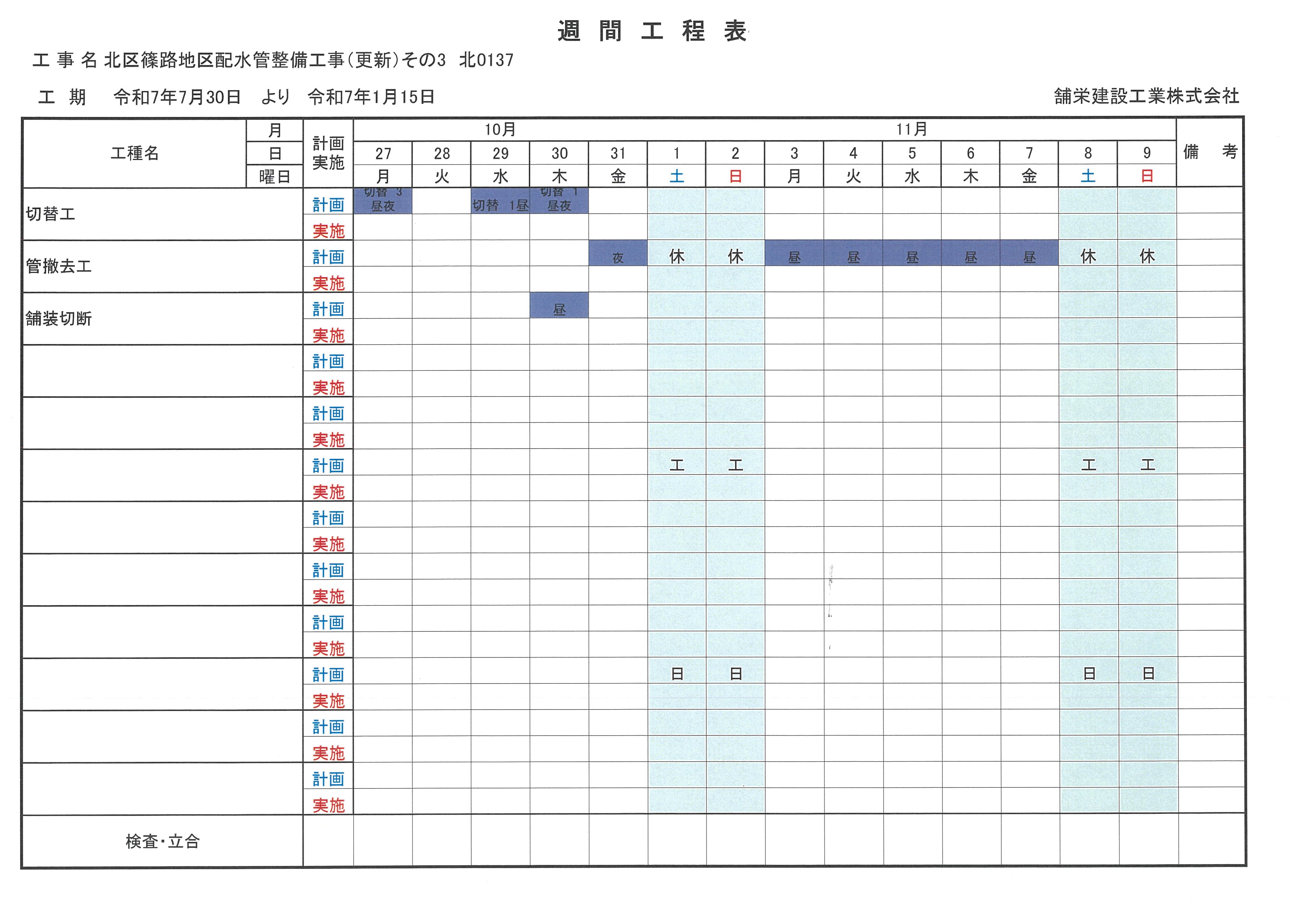 10月27日からの週間工程表になります。